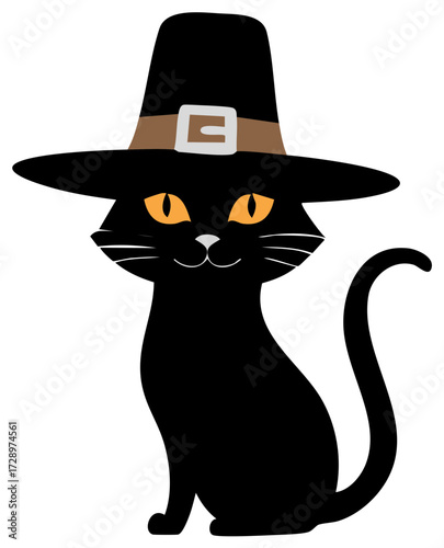 Black cat wearing a pilgrim hat, Halloween or Thanksgiving holiday themed illustration
