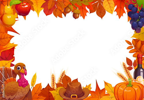 Autumn Thanksgiving harvest frame border with maple and oak fall leaves, grape, apple and pear, acorns, wheat harvest, pilgrim hat, turkey and wine. Festive cartoon vector seasonal banner template