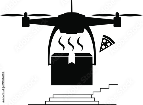 Drone with package, robotic dog, and police car icons quadcopter flying drone