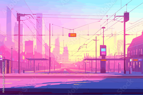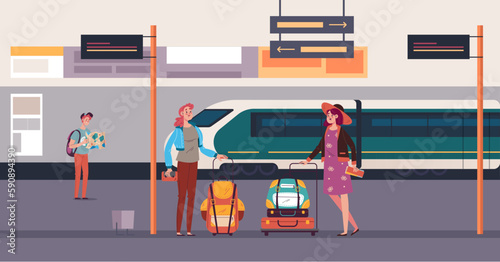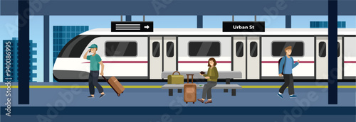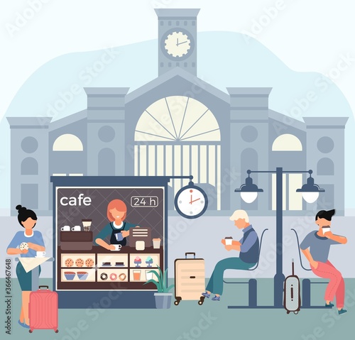 Urban railway station vector art. People waiting for the train. People holiday. Holiday time. Railway station with building view. Public train transportation. People go to work by train.