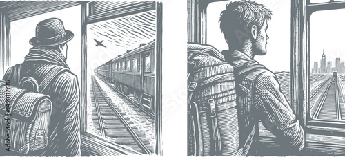 Vintage Woodcut Style Illustration of a Traveler Looking Out a Train Window – Engraving Design, Retro Travel Scene, Railway Journey Art, Hand-Drawn Etching Look
