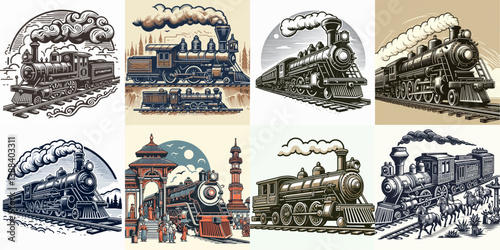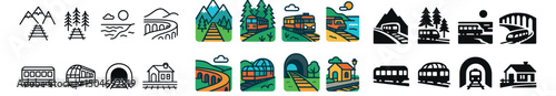 Trains bridges transportation railway vector graphic icons set travel tourism journey railroad station 100 editable stock vector illustration