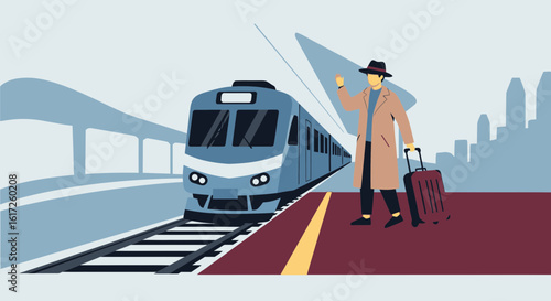 Stylish Traveler Waving Goodbye Beside Modern Train In Front Of City Skyline
