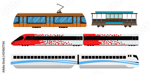 Subway passenger trains. High speed trains, metro ground, underground transport. Passenger transportation vehicles vector illustration icons set. Subway public van, tram metro, urban electric railway