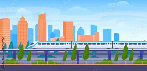 Modern high speed train riding city railway station vector cartoon illustration passenger transport