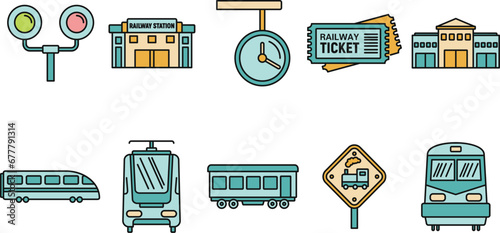 Train railway travel station passenger transportation line art icon set vector flat illustration