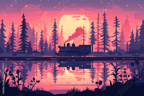 Fast train railway. Railroad side. Modern rail landscape. Speed transportation. Country road station. High travel industry. Forest scenery. Nature panorama. Vector flat garish background