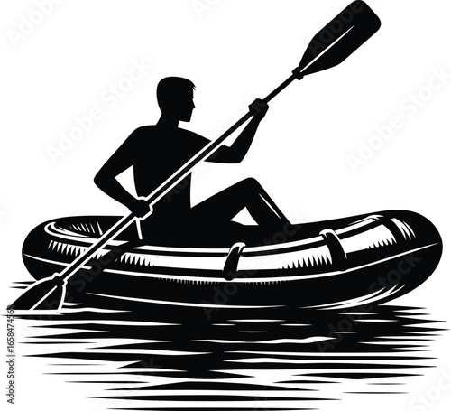 Cartoon Vector Stick Man Sailing a Rubber Boat