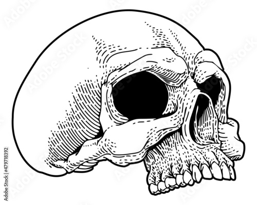 Human skull in a flower frame woodcut style. Vector engraving sketch illustration for tattoo and print design.