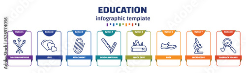 infographic template with icons and 8 options or steps. infographic for education concept. included three musketeers, love, attachment, school material, pencil case, shoe, microscope, sherlock