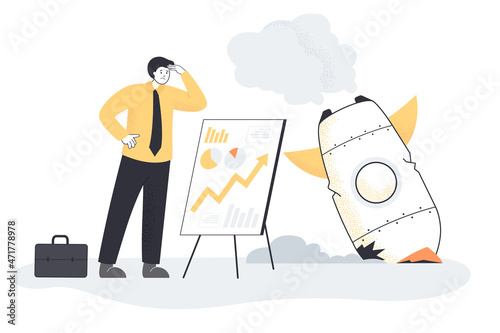 Bankrupt businessman with bad strategy and debris of rocket. Unsuccessful plan or idea, space vehicle crashing and falling flat vector illustration. Business or startup failure concept for banner