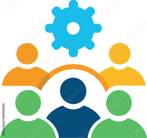 Teamwork, collaboration, innovation, technology integration, engineering design, human connection. Illustration of gears and person icon. Collaboration and innovation concept