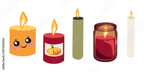 Vector candle set including pillar, beeswax, glass jar, and kawaii autumn candles. Great for seasonal clipart collections, planner stickers, and cozy home decor themes.