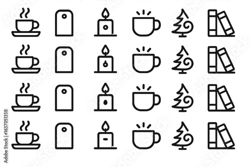 Mindful Evening Icons. Outline icon set of Mindful evening routine: warm tea, candle, journal, soft pillow,
