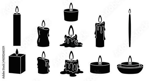 Set of ten black candle silhouettes. Vector illustration of various burning wax candles, including pillar, taper, tea light, and melting forms for graphic design.