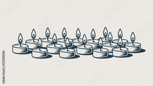 A drawing of multiple lit tea light candles arranged in rows on a light background in a simple style