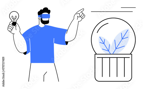 Man wearing VR headset interacts with augmented reality interface. Set of cartoon characters exploring metaverse. Future technology, virtual simulation, and UX concepts vector.