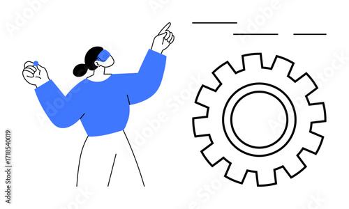 Person wearing VR headset interacting with Bitcoin coin and scales, exploring virtual finance. Ideal for blockchain, cryptocurrency, fintech, innovation, digital economy, VR, simple flat metaphor