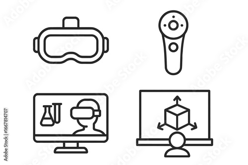 Technology gadgets and innovation line icons, representing artificial intelligence, virtual reality, and advanced computing in a modern design, perfect for technology