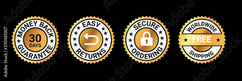 Money back, warranty, 24-hour support, etc. different types of online e-commerce security green badges isolated on white background.