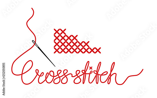 Vector cross stitches with needle and cross-stitch word made of thread isolated on white background