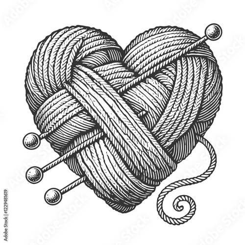 yarn balls intricately shaped into a heart, adorned with knitting needles and small heart accents sketch engraving generative ai vector illustration. Scratch board imitation. Black and white image.