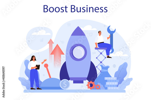 Launching a startup business. Illustration of a man holding a laptop with a rocket launching. launching a new project or idea