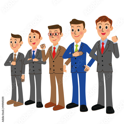 イラスト素材:笑顔の表情、女性たちの複数横並び、服装髪型違い