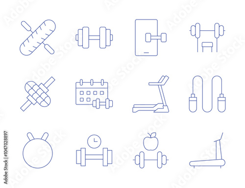 Fitness equipment icon set – outline style for gym and workout essentials: dumbbells, yoga mat, jump rope, water bottle, stopwatch, towel, fitness ball