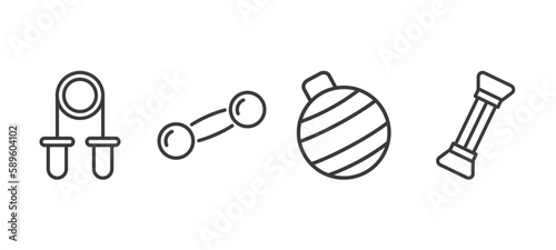set of fitness and gym thin line icons. fitness and gym outline icons included grip, dumbbells bar, fitness ball, arms extender vector.