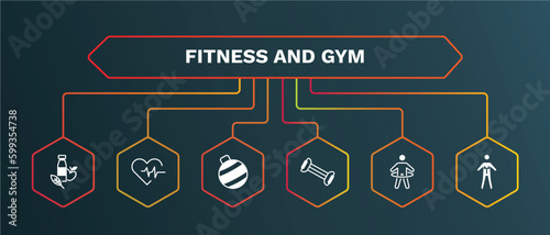 gym and fitness infographic element with icons and 6 step or option. gym and fitness icons such as muscles, weighing scale, fitness ball, press, gymnastic rings, iron shoot vector. can be used for