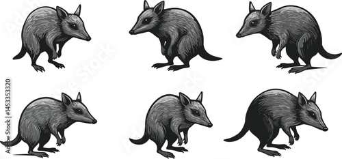 This vector shows a menacing black rat standing aggressively. This rat shows sharp claws, an open mouth, and long whiskers set against a white backdrop.