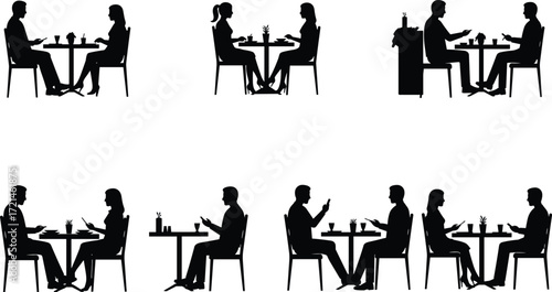 Collection of black silhouette figures of people in various poses, including sitting, standing, and interacting
