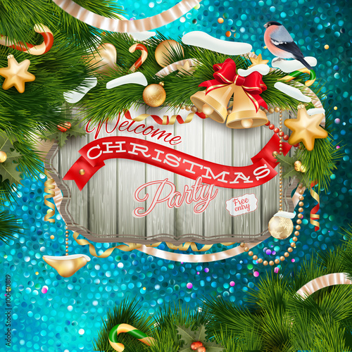 Banner with Christmas tree branches. Christmas garland with holly berries. Realistic looking Christmas tree branches decorated with berries and leaves