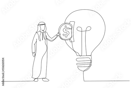 Continuous one line drawing Arab businesswoman putting dollar coin into piggy bank. Money savings, personal investment, finance, funding, bank deposit, capital accumulation. Single line design vector