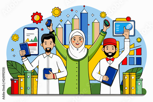 A group of Arab figures collaborate, holding gears and an upward arrow, symbolizing growth and teamwork.