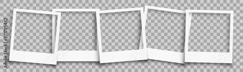 Realistic photo frames. Empty white photos frame vintage with adhesive tapes.Collection of vintage photo frames.Images different forms on wall, blank retro memory album.  Polaroid photo frame set.