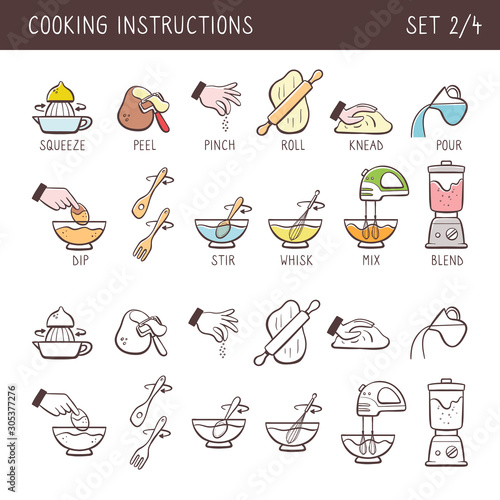 Cooking instruction icons of different food utensils and appliances for kitchen. Step guide constructor set line art vector black white isolated illustration.