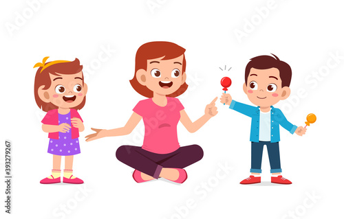 Vector illustration cartoon of mother and children cooking at kitchen counter. Kids doing housework chores at home concept.