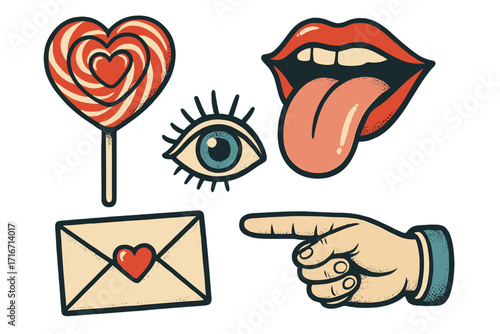 Lip Stickers Set. Patch female lips and mouth with a kiss, smile, tongue and teeth, Fashion collection badges elements vector illustration