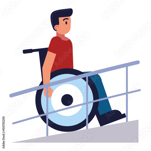 Businessman in wheelchair enters office via special ramps, office disability-friendly, building facility for disability, vector illustration