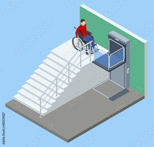 Isometric modern wheelchair lift near the building. The special elevator for the disabled. Adaptation for people with disabilities, disabled people. Assistance, rehabilitation and health care.