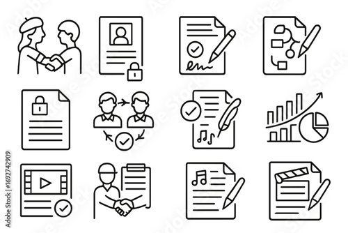 Line style icons of cooperative quests: team quest icon, group mission badge, multiplayer task tag, party quest file, shared objectives board, team progress chart, group challenge bubble, cooperative