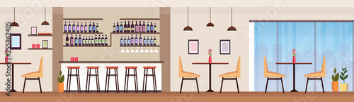 modern cocktail bar with alcohol bottles empty no people restaurant interior counter high chairs tables flat horizontal banner