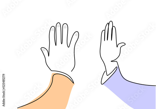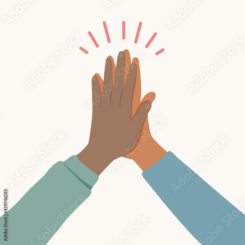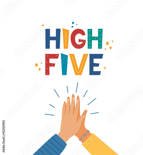 High five hand drawn lettering. Two hands clapping in high five gesture. Teamwork, friendship, unity, support, partnership, community. Concept for poster, logo, greeting card, banner, T-shirt. Vector.