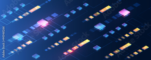 Hi-tech computer digital technology concept for banner. 3d Futuristic glowing lines and blocks. Wide perspective Blue background with various technological elements.
