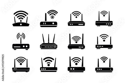 Wi-Fi router silhouette emitting strong network signal, wireless connection concept vector.