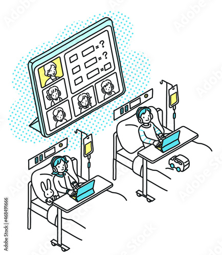 タブレット端末でオンライン面会をする中年の女性 ミドル 入院 病院 お見舞い イラスト