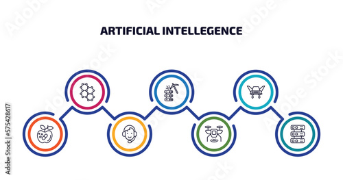 infographic template with icons and 7 options or steps. infographic for artificial intellegence concept. included memory transfer, servers, shopping bag, bionic eye, ai brain, mail, gaming editable