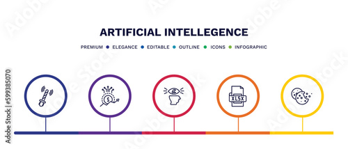 artificial intellegence infographic element with outline icons and 6 step or option. artificial intellegence icons such as rocket, ar monocle, humanoid, mobile flexible display, ai brain, nano